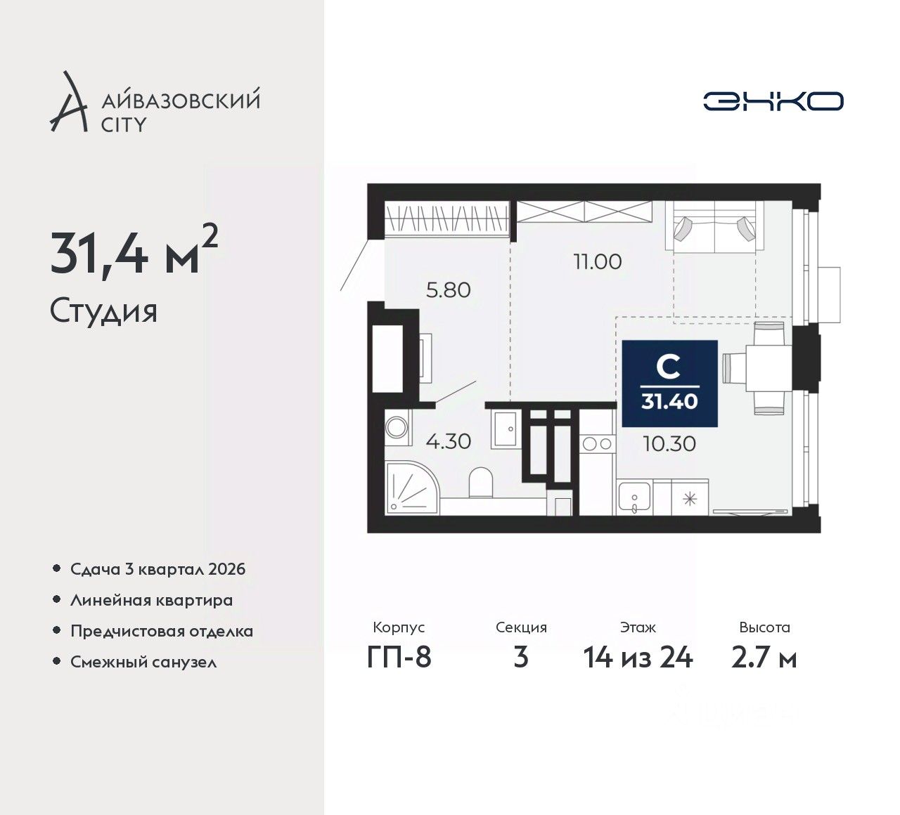 Однокомнатная квартира-студия с предчистовой отделкой в ЖК "Айвазовский City" на 14 этаже. Общая площадь: 31.4 кв.м., площадь гостиной 21.3 кв.м., из которых 10.3 кв.м. выделено под кухонную зону. Все окна выходят на одну сторону. В квартире один совмещенный санузел. Высота потолков 2.7 м.
