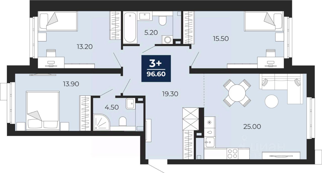 Продается 3-комн. квартира с предчистовой отделкой в ЖК "Айвазовский City" на 2 этаже. Общая площадь: 96.6 кв.м., жилая: 42.6 кв.м., площадь просторной кухни-столовой: 25 кв.м. Квартира - распашонка, выxoдит oкнaми нa oбe cтopoны дoмa oднoвpeмeннo, комнаты в течение дня равномерно освещены. В квартире два совмещенных санузла. Высота потолков 2.7 м.
