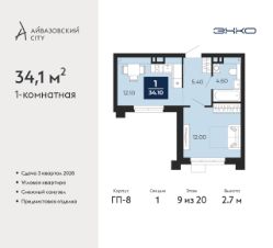 1-комн. квартира от застройщика с предчистовой отделкой в ЖК "Айвазовский City" на 9 этаже. Общая площадь: 34.1 кв.м., жилая: 12 кв.м., площадь просторной кухни-столовой: 12.1 кв.м. Угловая квартира, идеально подойдет любителям тишины и панорамных видов. В квартире один совмещенный санузел. Высота потолков 2.7 м.