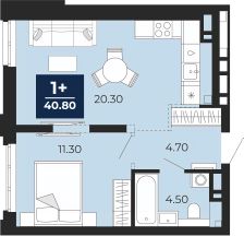 Однокомнатная квартира с предчистовой отделкой в ЖК "Айвазовский City" на 10 этаже. Общая площадь: 40.8 кв.м., жилая: 11.3 кв.м., площадь просторной кухни-столовой: 20.3 кв.м. Все окна выходят на одну сторону. В квартире один совмещенный санузел. Высота потолков 2.7 м.