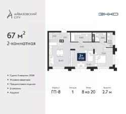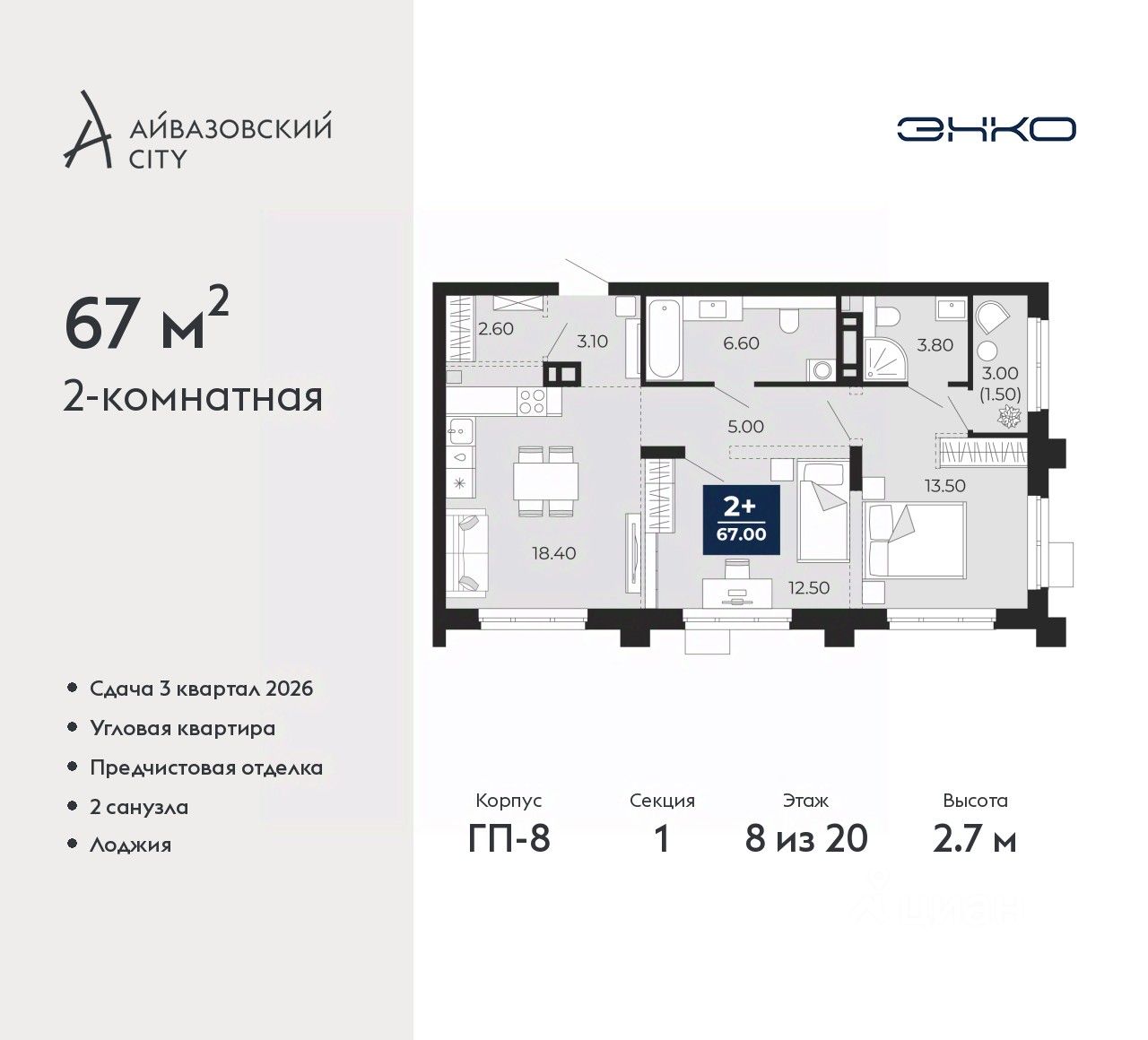 Двухкомнатная квартира от застройщика с предчистовой отделкой в ЖК "Айвазовский City" на 8 этаже. Общая площадь: 67 кв.м., жилая: 26 кв.м., площадь просторной кухни-столовой: 18.4 кв.м. Квартира угловая, очень светлая, естественная вентиляция при открытии окон. В квартире одна лоджия, два совмещенных санузла. Высота потолков 2.7 м.