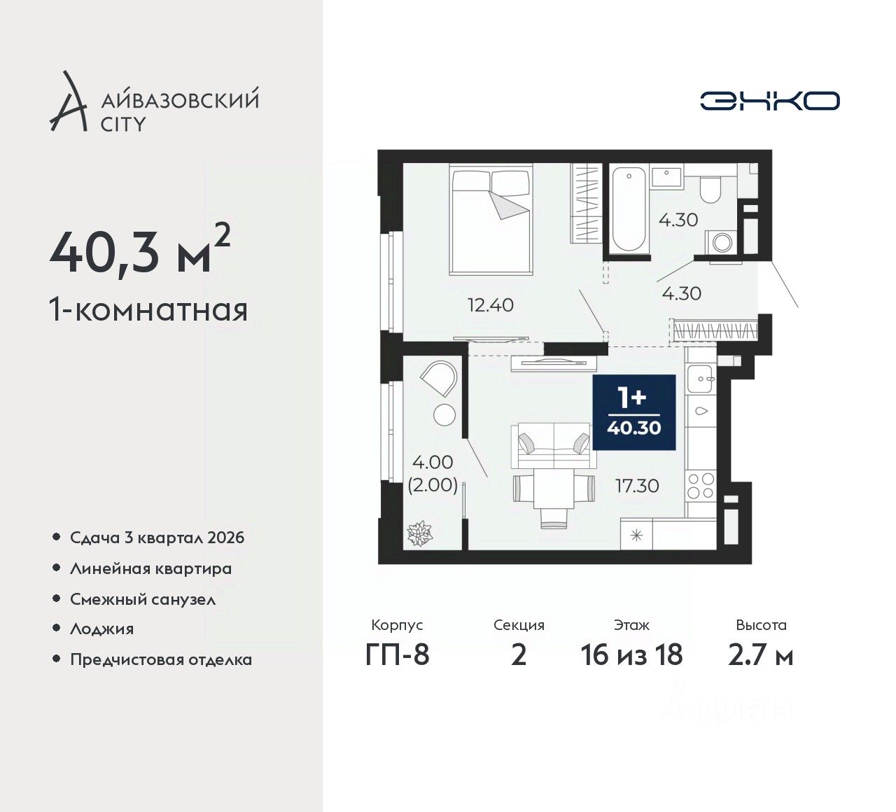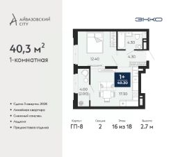 Продается 1-комн. квартира с предчистовой отделкой в ЖК "Айвазовский City" на 16 этаже. Общая площадь: 40.3 кв.м., жилая: 12.4 кв.м., площадь просторной кухни-столовой: 17.3 кв.м. Все окна выходят на одну сторону. В квартире одна лоджия, один совмещенный санузел. Высота потолков 2.7 м.