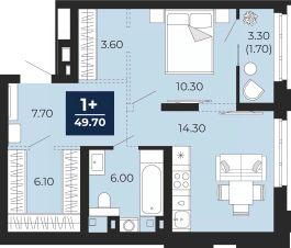 Просторная 1-комн. квартира с предчистовой отделкой в ЖК "Айвазовский City" на 2 этаже. Общая площадь: 49.7 кв.м., жилая: 10.3 кв.м., площадь просторной кухни-столовой: 14.3 кв.м. Все окна выходят на одну сторону. В квартире одна лоджия, один совмещенный санузел. Высота потолков 2.7 м.