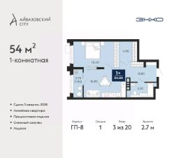 Просторная однокомнатная квартира с предчистовой отделкой в ЖК "Айвазовский City" на 3 этаже. Общая площадь: 54 кв.м., жилая: 16.4 кв.м., площадь просторной кухни-столовой: 16.8 кв.м. Все окна выходят на одну сторону. В квартире одна лоджия, один совмещенный санузел. Высота потолков 2.7 м.