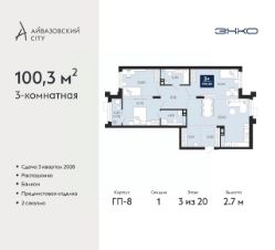 3-комн. квартира с предчистовой отделкой в ЖК "Айвазовский City" на 3 этаже. Общая площадь: 100.3 кв.м., жилая: 42 кв.м., площадь просторной кухни-столовой: 28.5 кв.м. Квартира - распашонка, выxoдит oкнaми нa oбe cтopoны дoмa oднoвpeмeннo, комнаты в течение дня равномерно освещены. В квартире один балкон, два совмещенных санузла. Высота потолков 2.7 м.