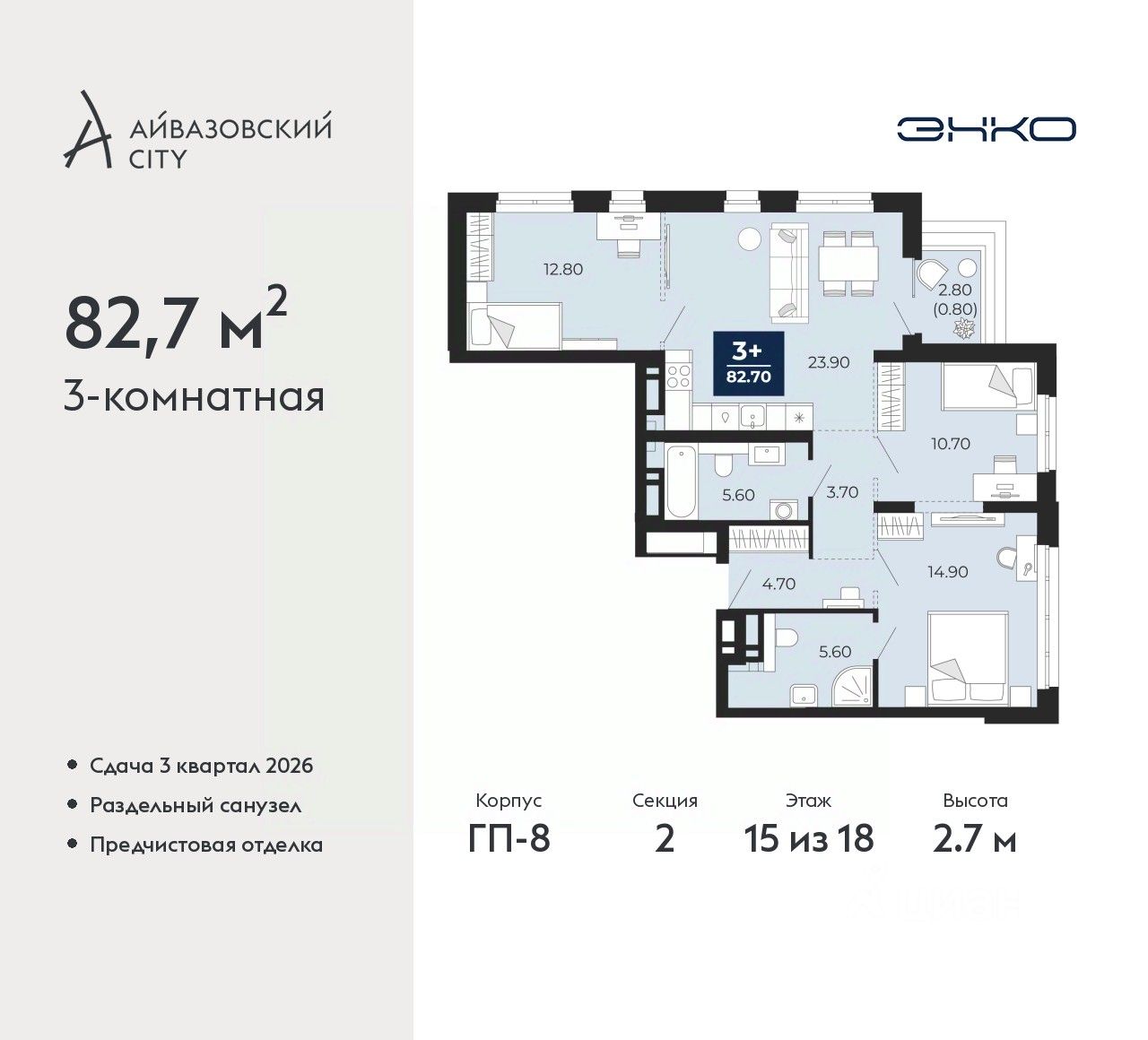 3-комн. квартира от застройщика с предчистовой отделкой в ЖК "Айвазовский City" на 15 этаже. Общая площадь: 82.7 кв.м., жилая: 38.4 кв.м., площадь просторной кухни-столовой: 23.9 кв.м. Квартира без проходных комнат, окна выходят нa три cтopoны дома. В квартире одна лоджия, два совмещенных санузла. Высота потолков 2.7 м.