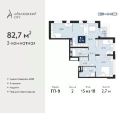 Просторная 3-комн. квартира с предчистовой отделкой в ЖК "Айвазовский City" на 15 этаже. Общая площадь: 82.7 кв.м., жилая: 38.4 кв.м., площадь просторной кухни-столовой: 23.9 кв.м. Квартира без проходных комнат, окна выходят нa три cтopoны дома. В квартире одна лоджия, два совмещенных санузла. Высота потолков 2.7 м.