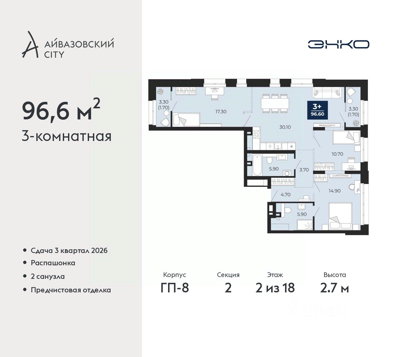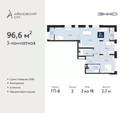 3-комн. квартира от застройщика с предчистовой отделкой в ЖК "Айвазовский City" на 2 этаже. Общая площадь: 96.6 кв.м., жилая: 42.6 кв.м., площадь просторной кухни-столовой: 25 кв.м. Квартира - распашонка, без проходных комнат, окна выходят на paзные стороны дома. В квартире два совмещенных санузла. Высота потолков 2.7 м.