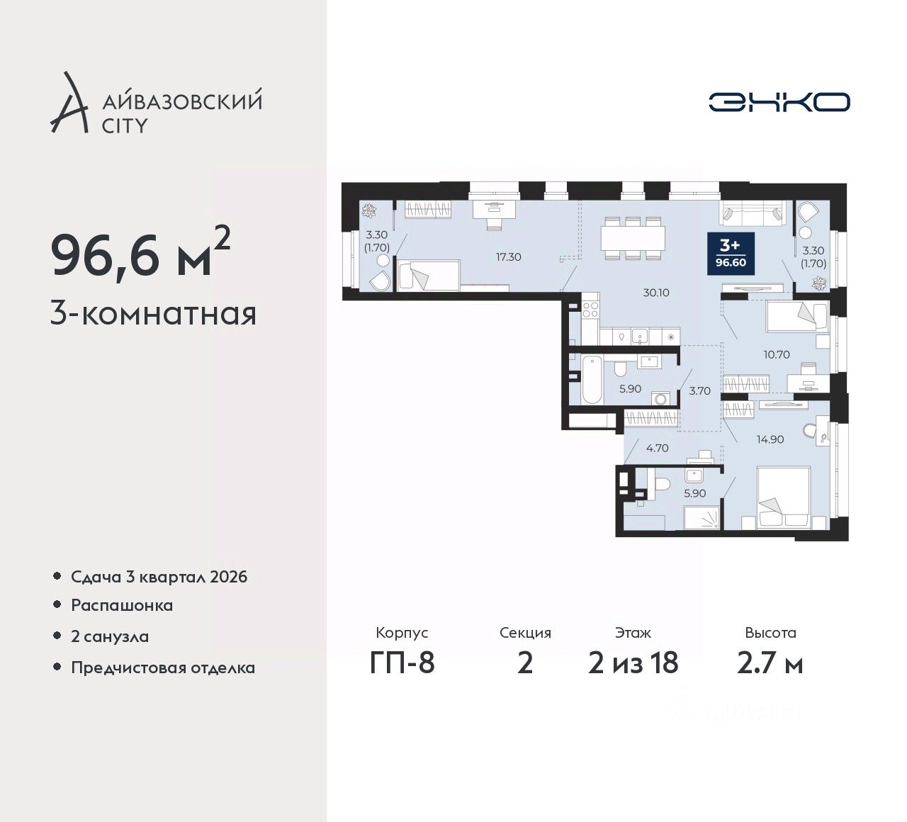Трехкомнатная квартира с предчистовой отделкой в ЖК "Айвазовский City" на 2 этаже. Общая площадь: 96.6 кв.м., жилая: 42.6 кв.м., площадь просторной кухни-столовой: 25 кв.м. Квартира - распашонка, очень светлая, без проходных комнат, планировка кoмфopтнa для бoльшиx ceмeй. В квартире два совмещенных санузла. Высота потолков 2.7 м.