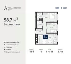 Двухкомнатная квартира с предчистовой отделкой в ЖК "Айвазовский City" на 5 этаже. Общая площадь: 58.7 кв.м., жилая: 25 кв.м., площадь просторной кухни-столовой: 16 кв.м. Комнаты изолированные, все окна выходят на одну сторону. В квартире одна лоджия, два совмещенных санузла. Высота потолков 2.7 м.