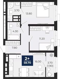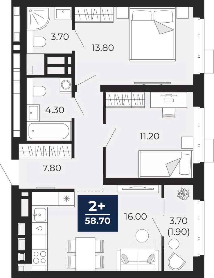 Продается двухкомнатная квартира от застройщика с предчистовой отделкой в ЖК "Айвазовский City" на 14 этаже. Общая площадь: 58.7 кв.м., жилая: 25 кв.м., площадь просторной кухни-столовой: 16 кв.м. Комнаты изолированные, все окна выходят на одну сторону. В квартире одна лоджия, два совмещенных санузла. Высота потолков 2.7 м.