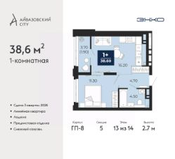 Продается однокомнатная квартира с предчистовой отделкой в ЖК "Айвазовский City" на 13 этаже. Общая площадь: 38.6 кв.м., жилая: 11.3 кв.м., площадь просторной кухни-столовой: 16.2 кв.м. Все окна выходят на одну сторону. В квартире одна лоджия, один совмещенный санузел. Высота потолков 2.7 м.
