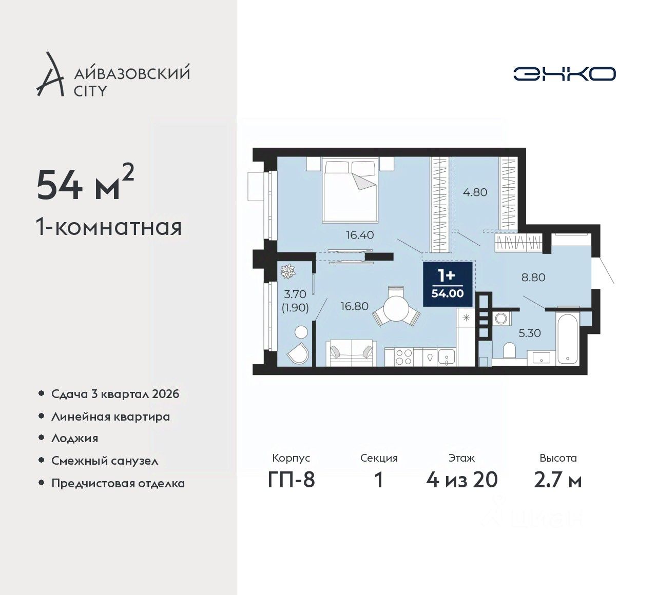 1-комн. квартира с предчистовой отделкой в ЖК "Айвазовский City" на 4 этаже. Общая площадь: 54 кв.м., жилая: 16.4 кв.м., площадь просторной кухни-столовой: 16.8 кв.м. Все окна выходят на одну сторону. В квартире одна лоджия, один совмещенный санузел. Высота потолков 2.7 м.