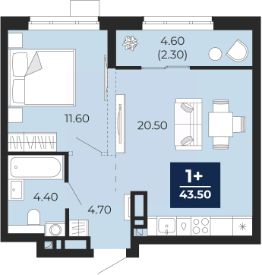 Просторная 1-комн. квартира с предчистовой отделкой в ЖК "Айвазовский City" на 5 этаже. Общая площадь: 43.5 кв.м., жилая: 11.6 кв.м., площадь просторной кухни-столовой: 20.5 кв.м. Все окна выходят на одну сторону. В квартире одна лоджия, один совмещенный санузел. Высота потолков 2.72 м.