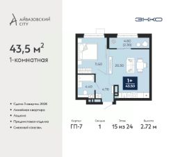 Однокомнатная квартира с предчистовой отделкой в ЖК "Айвазовский City" на 15 этаже. Общая площадь: 43.5 кв.м., жилая: 11.6 кв.м., площадь просторной кухни-столовой: 20.5 кв.м. Все окна выходят на одну сторону. В квартире одна лоджия, один совмещенный санузел. Высота потолков 2.72 м.