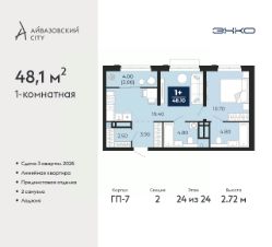 Продается 1-комн. квартира от застройщика с предчистовой отделкой в ЖК "Айвазовский City" на 24 этаже. Общая площадь: 48.1 кв.м., жилая: 10.7 кв.м., площадь просторной кухни-столовой: 19.4 кв.м. Все окна выходят на одну сторону. В квартире одна лоджия, два совмещенных санузла. Высота потолков 2.72 м.