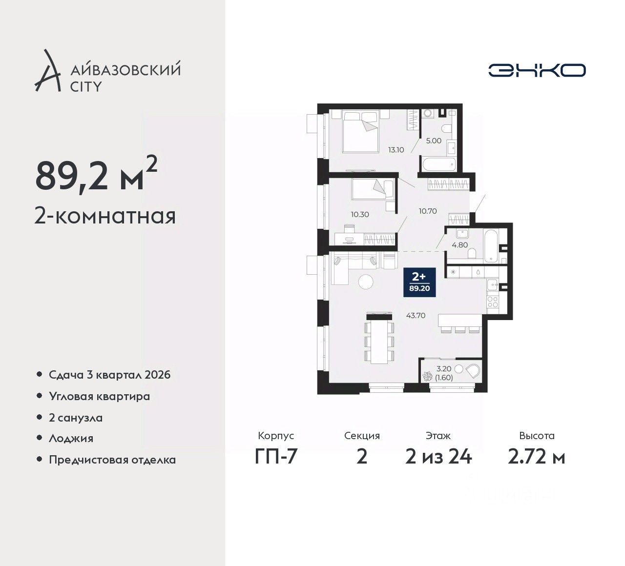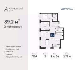 Просторная двухкомнатная квартира с предчистовой отделкой в ЖК "Айвазовский City" на 2 этаже. Общая площадь: 89.2 кв.м., жилая: 23.4 кв.м., площадь просторной кухни-столовой: 43.7 кв.м. Угловая квартира, очень светлая, естественная вентиляция при открытии окон. В квартире одна лоджия, два совмещенных санузла. Высота потолков 2.72 м.