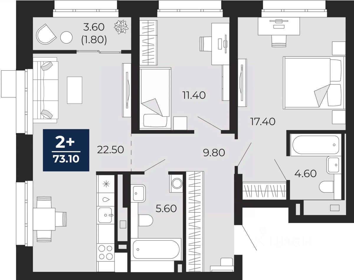 Продается 2-комн. квартира с предчистовой отделкой в ЖК "Айвазовский City" на 2 этаже. Общая площадь: 73.1 кв.м., жилая: 28.8 кв.м., площадь просторной кухни-столовой: 22.5 кв.м. Угловая квартира, очень светлая, естественная вентиляция при открытии окон. В квартире одна лоджия, два совмещенных санузла. Высота потолков 2.72 м.