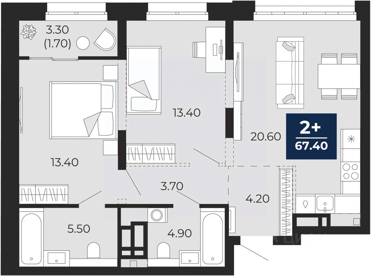 Продается двухкомнатная квартира от застройщика с предчистовой отделкой в ЖК "Айвазовский City" на 10 этаже. Общая площадь: 67.4 кв.м., жилая: 26.8 кв.м., площадь просторной кухни-столовой: 20.6 кв.м. Комнаты изолированные, все окна выходят на одну сторону. В квартире одна лоджия, два совмещенных санузла. Высота потолков 2.72 м.