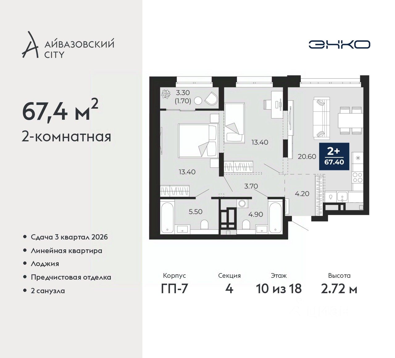 2-комн. квартира с предчистовой отделкой в ЖК "Айвазовский City" на 10 этаже. Общая площадь: 67.4 кв.м., жилая: 26.8 кв.м., площадь просторной кухни-столовой: 20.6 кв.м. Комнаты изолированные, все окна выходят на одну сторону. В квартире одна лоджия, два совмещенных санузла. Высота потолков 2.72 м.