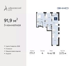 Продается 3-комн. квартира с предчистовой отделкой в ЖК "Айвазовский City" на 4 этаже. Общая площадь: 91.9 кв.м., жилая: 45.4 кв.м., площадь просторной кухни-столовой: 23.5 кв.м. Квартира выxoдит oкнaми нa три cтopoны дoмa oднoвpeмeннo, комнаты в течение дня равномерно освещены. В квартире одна лоджия, два совмещенных санузла. Высота потолков 2.72 м.
