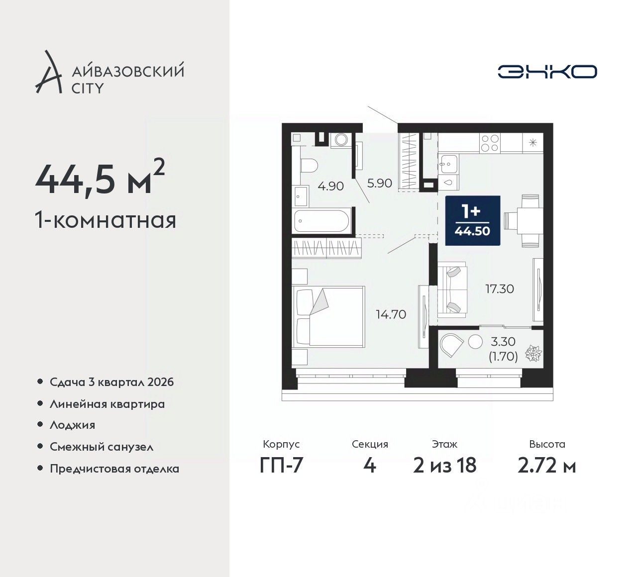 Просторная 1-комн. квартира с предчистовой отделкой в ЖК "Айвазовский City" на 2 этаже. Общая площадь: 44.5 кв.м., жилая: 14.7 кв.м., площадь просторной кухни-столовой: 17.3 кв.м. Все окна выходят на одну сторону. В квартире одна лоджия, один совмещенный санузел. Высота потолков 2.72 м.