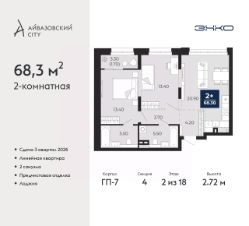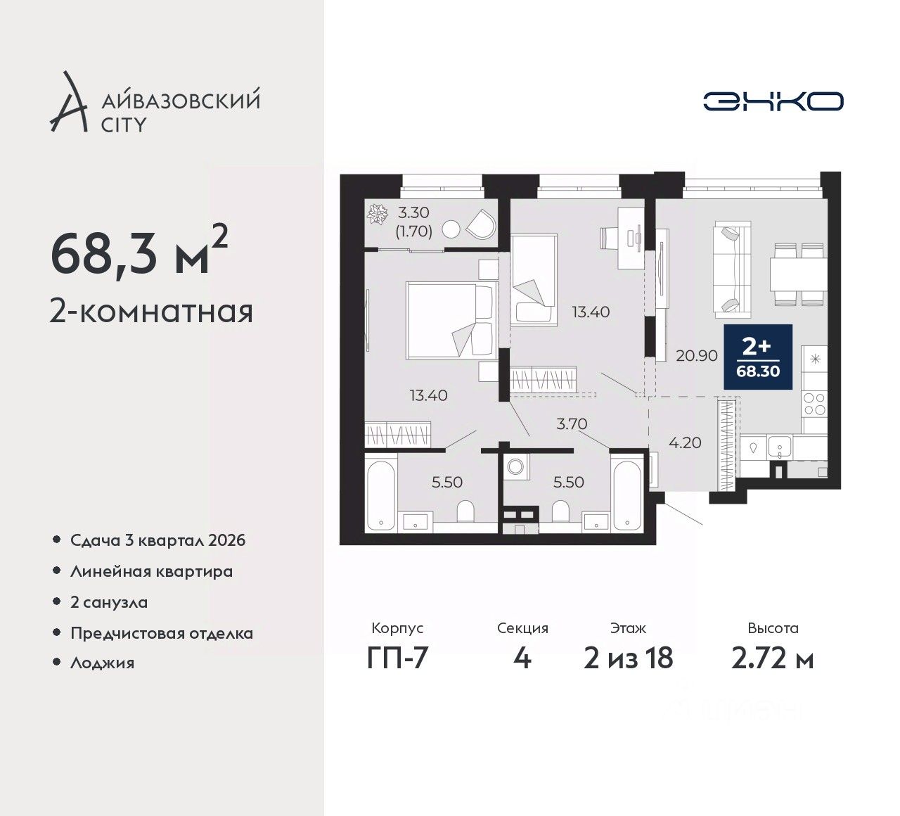 Продается двухкомнатная квартира с предчистовой отделкой в ЖК "Айвазовский City" на 2 этаже. Общая площадь: 68.3 кв.м., жилая: 26.8 кв.м., площадь просторной кухни-столовой: 20.9 кв.м. Комнаты изолированные, все окна выходят на одну сторону. В квартире одна лоджия, два совмещенных санузла. Высота потолков 2.72 м.