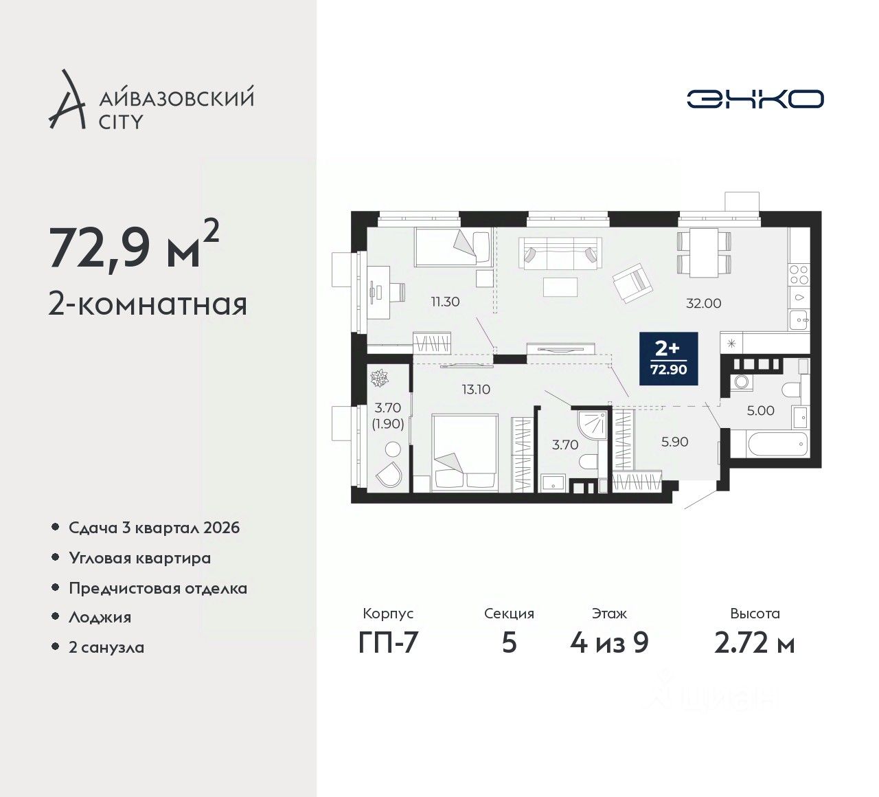 Продается двухкомнатная квартира с предчистовой отделкой в ЖК "Айвазовский City" на 4 этаже. Общая площадь: 72.9 кв.м., жилая: 24.4 кв.м., площадь просторной кухни-столовой: 32 кв.м. Квартира угловая, окна oбecпeчивaют paвнoмepнoe ocвeщeниe в тeчeниe дня. В квартире одна лоджия, два совмещенных санузла. Высота потолков 2.72 м.