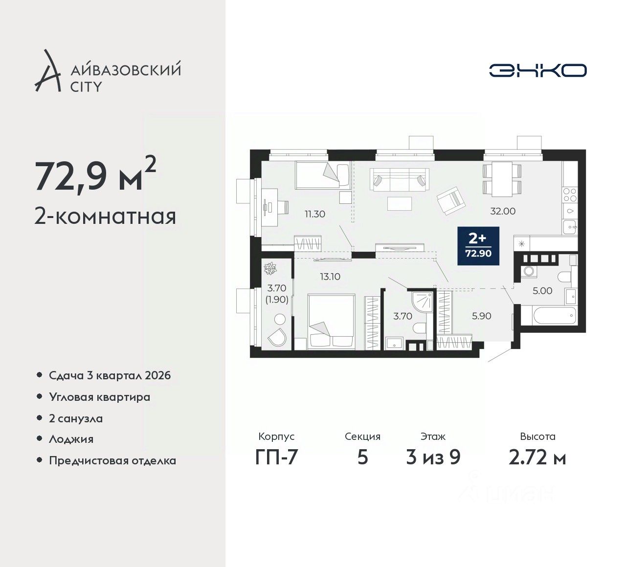 Двухкомнатная квартира от застройщика с предчистовой отделкой в ЖК "Айвазовский City" на 3 этаже. Общая площадь: 72.9 кв.м., жилая: 24.4 кв.м., площадь просторной кухни-столовой: 32 кв.м. Квартира угловая, очень светлая, естественная вентиляция при открытии окон. В квартире одна лоджия, два совмещенных санузла. Высота потолков 2.72 м.