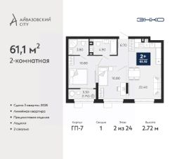 Продается 2-комн. квартира с предчистовой отделкой в ЖК "Айвазовский City" на 2 этаже. Общая площадь: 61.1 кв.м., жилая: 21.6 кв.м., площадь просторной кухни-столовой: 22.4 кв.м. Комнаты изолированные, все окна выходят на одну сторону. В квартире одна лоджия, два совмещенных санузла. Высота потолков 2.72 м.