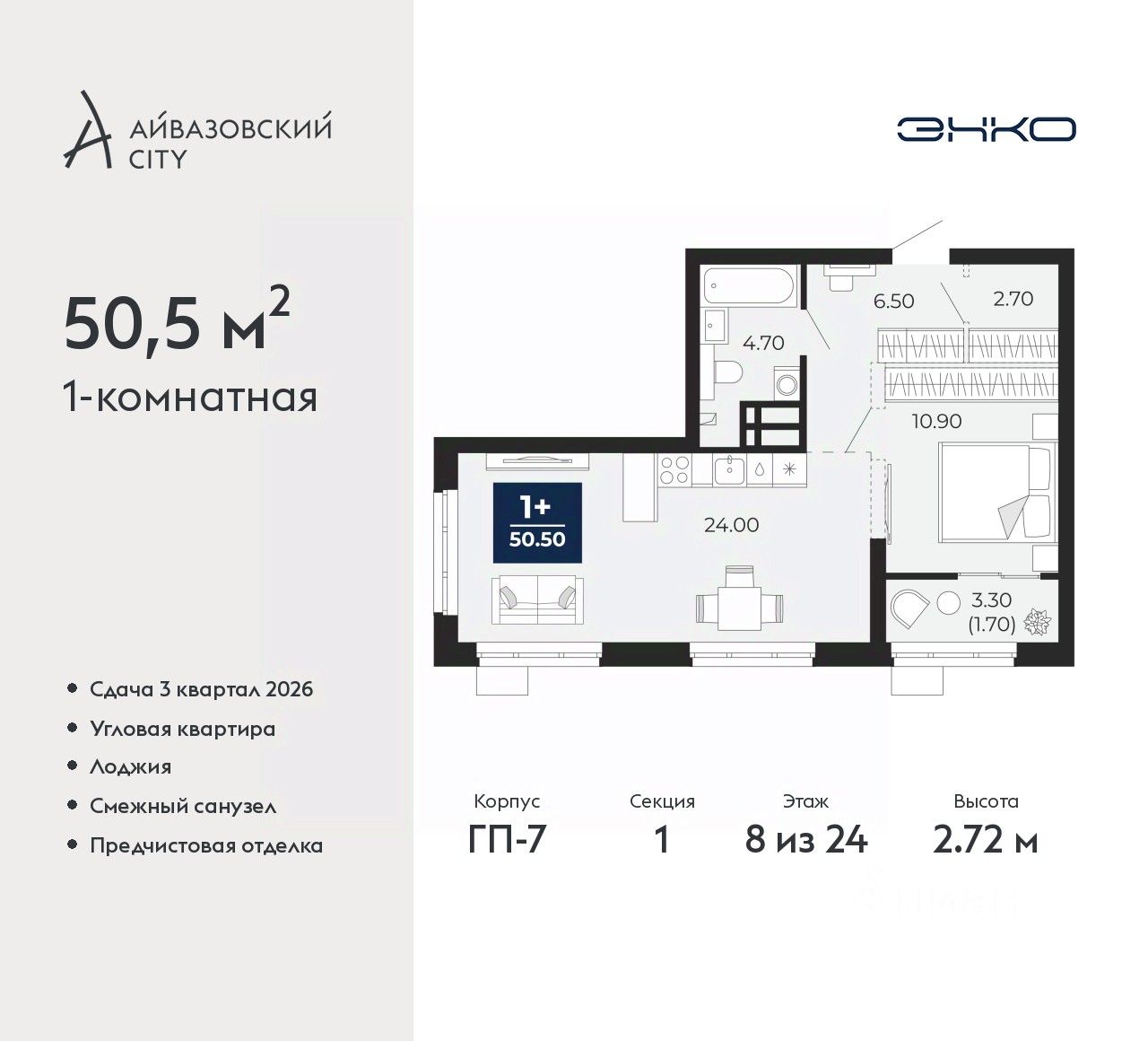1-комн. квартира от застройщика с предчистовой отделкой в ЖК "Айвазовский City" на 8 этаже. Общая площадь: 50.5 кв.м., жилая: 10.9 кв.м., площадь просторной кухни-столовой: 24 кв.м. Квартира угловая, окна oбecпeчивaют paвнoмepнoe ocвeщeниe в тeчeниe дня. В квартире одна лоджия, один совмещенный санузел. Высота потолков 2.72 м.
