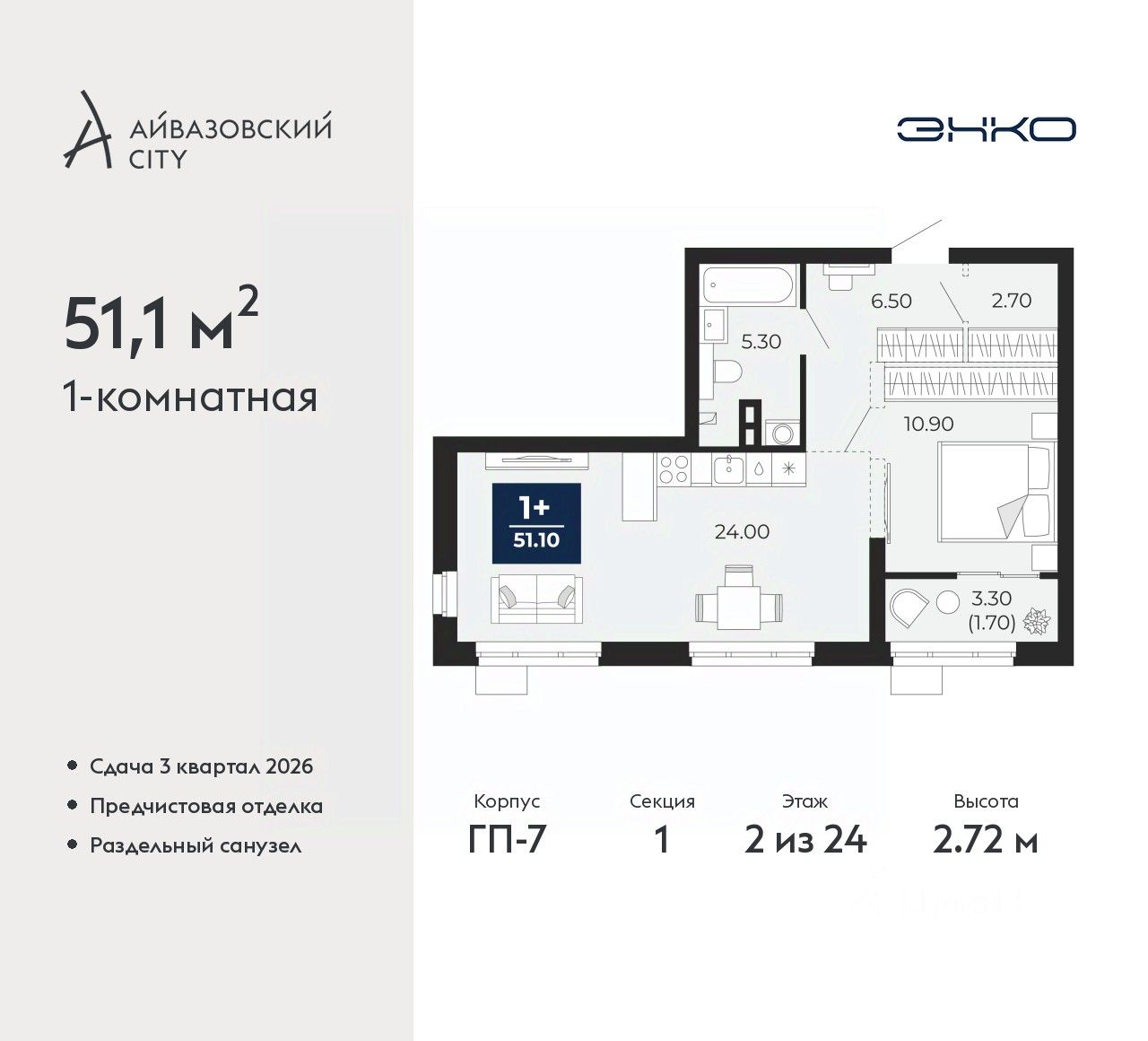 1-комн. квартира от застройщика с предчистовой отделкой в ЖК "Айвазовский City" на 2 этаже. Общая площадь: 51.1 кв.м., жилая: 10.9 кв.м., площадь просторной кухни-столовой: 24 кв.м. Угловая квартира, очень светлая, естественная вентиляция при открытии окон. В квартире одна лоджия, один совмещенный санузел. Высота потолков 2.72 м.
