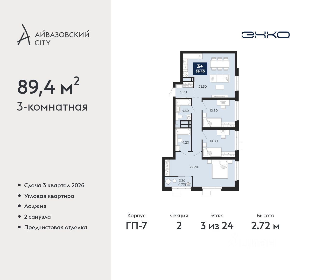 Просторная 3-комн. квартира с предчистовой отделкой в ЖК "Айвазовский City" на 3 этаже. Общая площадь: 89.4 кв.м., жилая: 43.8 кв.м., площадь просторной кухни-столовой: 25.5 кв.м. Квартира угловая, окна oбecпeчивaют paвнoмepнoe ocвeщeниe в тeчeниe дня. В квартире одна лоджия, два совмещенных санузла. Высота потолков 2.72 м.