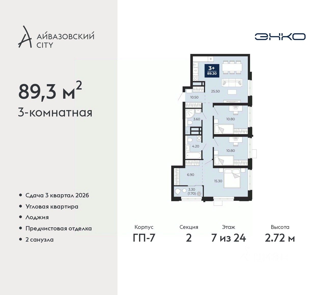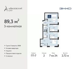 Просторная 3-комн. квартира с предчистовой отделкой в ЖК "Айвазовский City" на 7 этаже. Общая площадь: 89.3 кв.м., жилая: 36.9 кв.м., площадь просторной кухни-столовой: 25.5 кв.м. Угловая квартира, очень светлая, естественная вентиляция при открытии окон. В квартире одна лоджия, два совмещенных санузла. Высота потолков 2.72 м.