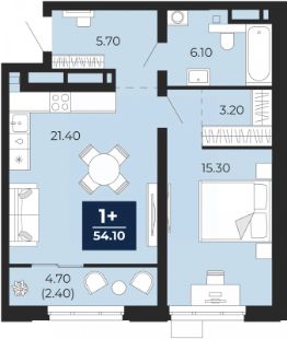 1-комн. квартира с предчистовой отделкой в ЖК "Айвазовский City" на 5 этаже. Общая площадь: 54.1 кв.м., жилая: 15.3 кв.м., площадь просторной кухни-столовой: 22 кв.м. Все окна выходят на одну сторону. В квартире одна лоджия, один совмещенный санузел. Высота потолков 2.72 м.
