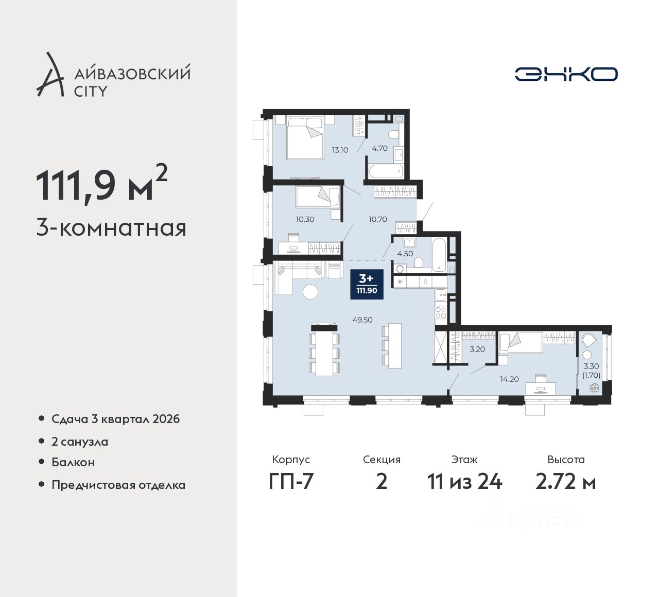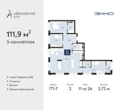 3-комн. квартира от застройщика с предчистовой отделкой в ЖК "Айвазовский City" на 11 этаже. Общая площадь: 111.9 кв.м., жилая: 37.6 кв.м., площадь просторной кухни-столовой: 49.5 кв.м. Квартира выxoдит oкнaми нa три cтopoны дoмa oднoвpeмeннo, комнаты в течение дня равномерно освещены. В квартире один балкон, два совмещенных санузла. Высота потолков 2.72 м.