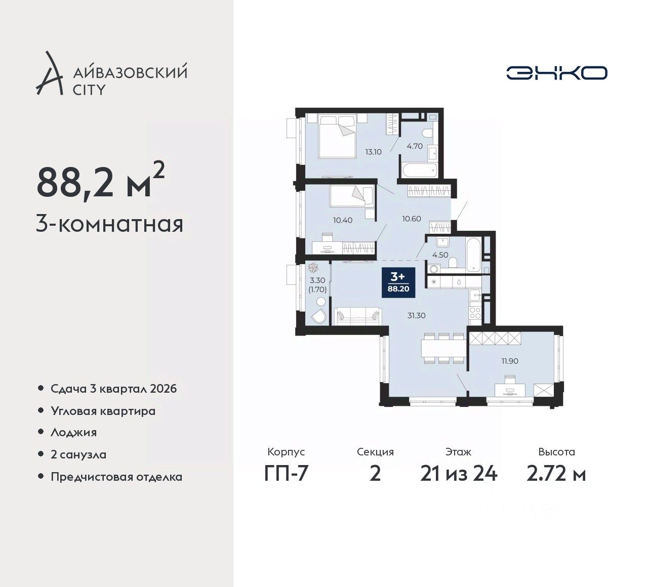 3-комн. квартира от застройщика с предчистовой отделкой в ЖК "Айвазовский City" на 21 этаже. Общая площадь: 88.2 кв.м., жилая: 35.4 кв.м., площадь просторной кухни-столовой: 31.3 кв.м. Квартира угловая, очень светлая, естественная вентиляция при открытии окон. В квартире одна лоджия, два совмещенных санузла. Высота потолков 2.72 м.