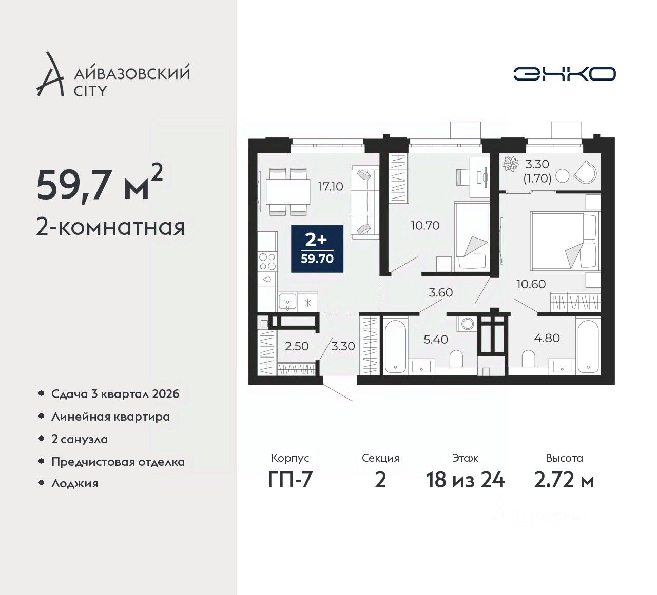 2-комн. квартира от застройщика с предчистовой отделкой в ЖК "Айвазовский City" на 18 этаже. Общая площадь: 59.7 кв.м., жилая: 21.3 кв.м., площадь просторной кухни-столовой: 17.1 кв.м. Комнаты изолированные, все окна выходят на одну сторону. В квартире одна лоджия, два совмещенных санузла. Высота потолков 2.72 м.