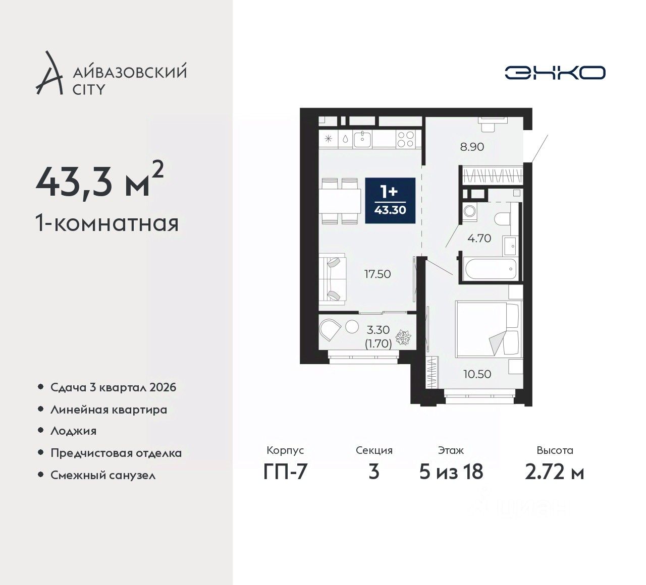 1-комн. квартира с предчистовой отделкой в ЖК "Айвазовский City" на 5 этаже. Общая площадь: 43.3 кв.м., жилая: 10.5 кв.м., площадь просторной кухни-столовой: 17.5 кв.м. Все окна выходят на одну сторону. В квартире одна лоджия, один совмещенный санузел. Высота потолков 2.72 м.