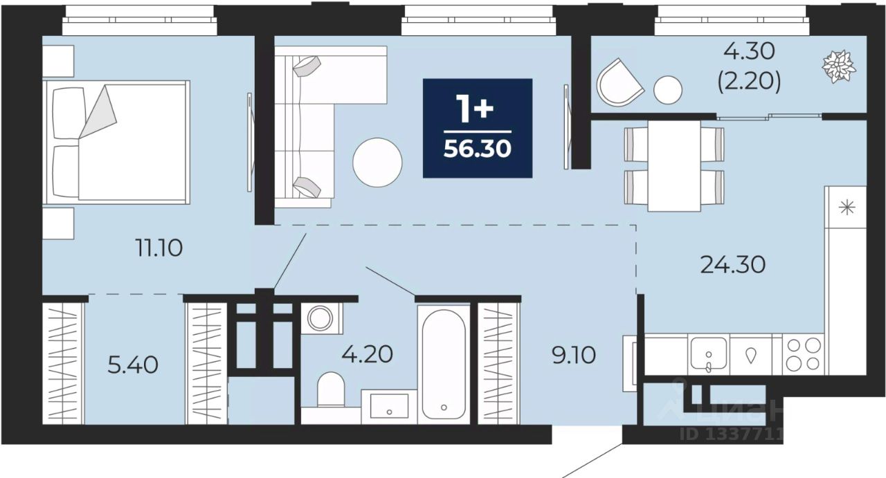 Просторная однокомнатная квартира с предчистовой отделкой в ЖК "Айвазовский City" на 18 этаже. Общая площадь: 56.3 кв.м., жилая: 11.1 кв.м., площадь просторной кухни-столовой: 24.3 кв.м. Все окна выходят на одну сторону. В квартире одна лоджия, один совмещенный санузел. Высота потолков 2.72 м.