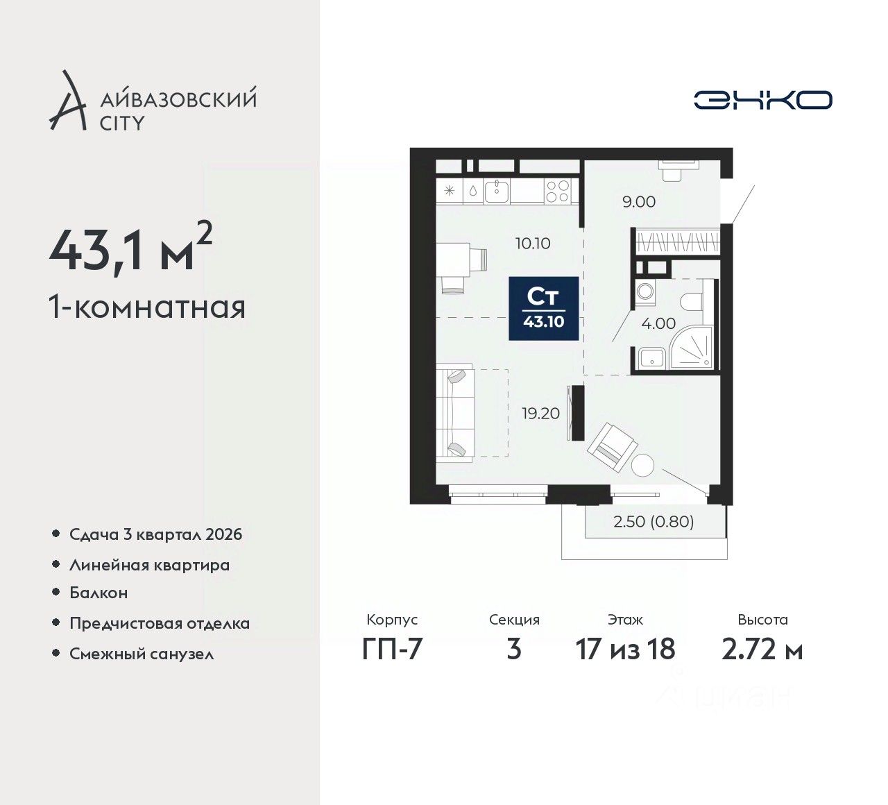 Просторная однокомнатная квартира с предчистовой отделкой в ЖК "Айвазовский City" на 17 этаже. Общая площадь: 43.1 кв.м., жилая: 19.2 кв.м., площадь просторной кухни-столовой: 10.1 кв.м. Все окна выходят на одну сторону. В квартире один балкон, один совмещенный санузел. Высота потолков 2.72 м.