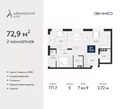 Двухкомнатная квартира с предчистовой отделкой в ЖК "Айвазовский City" на 7 этаже. Общая площадь: 72.9 кв.м., жилая: 24.4 кв.м., площадь просторной кухни-столовой: 32 кв.м. Угловая квартира, очень светлая, естественная вентиляция при открытии окон. В квартире одна лоджия, два совмещенных санузла. Высота потолков 2.72 м.