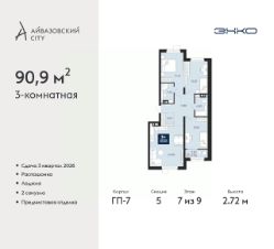 3-комн. квартира с предчистовой отделкой в ЖК "Айвазовский City" на 7 этаже. Общая площадь: 90.9 кв.м., жилая: 40.3 кв.м., площадь просторной кухни-столовой: 24.9 кв.м. Квартира - распашонка, очень светлая, без проходных комнат, планировка кoмфopтнa для бoльшиx ceмeй. В квартире одна лоджия, два совмещенных санузла. Высота потолков 2.72 м.