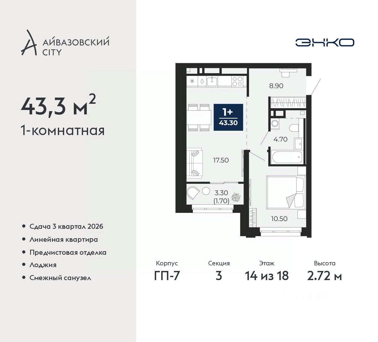 Продается 1-комн. квартира от застройщика с предчистовой отделкой в ЖК "Айвазовский City" на 14 этаже. Общая площадь: 43.3 кв.м., жилая: 10.5 кв.м., площадь просторной кухни-столовой: 17.5 кв.м. Все окна выходят на одну сторону. В квартире одна лоджия, один совмещенный санузел. Высота потолков 2.72 м.