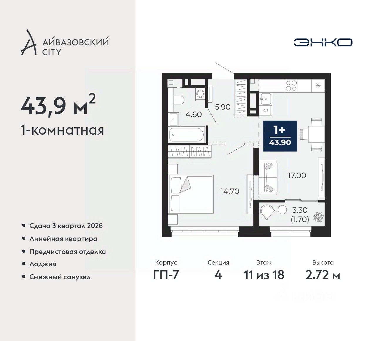 1-комн. квартира от застройщика с предчистовой отделкой в ЖК "Айвазовский City" на 11 этаже. Общая площадь: 43.9 кв.м., жилая: 14.7 кв.м., площадь просторной кухни-столовой: 17 кв.м. Все окна выходят на одну сторону. В квартире одна лоджия, один совмещенный санузел. Высота потолков 2.72 м.
