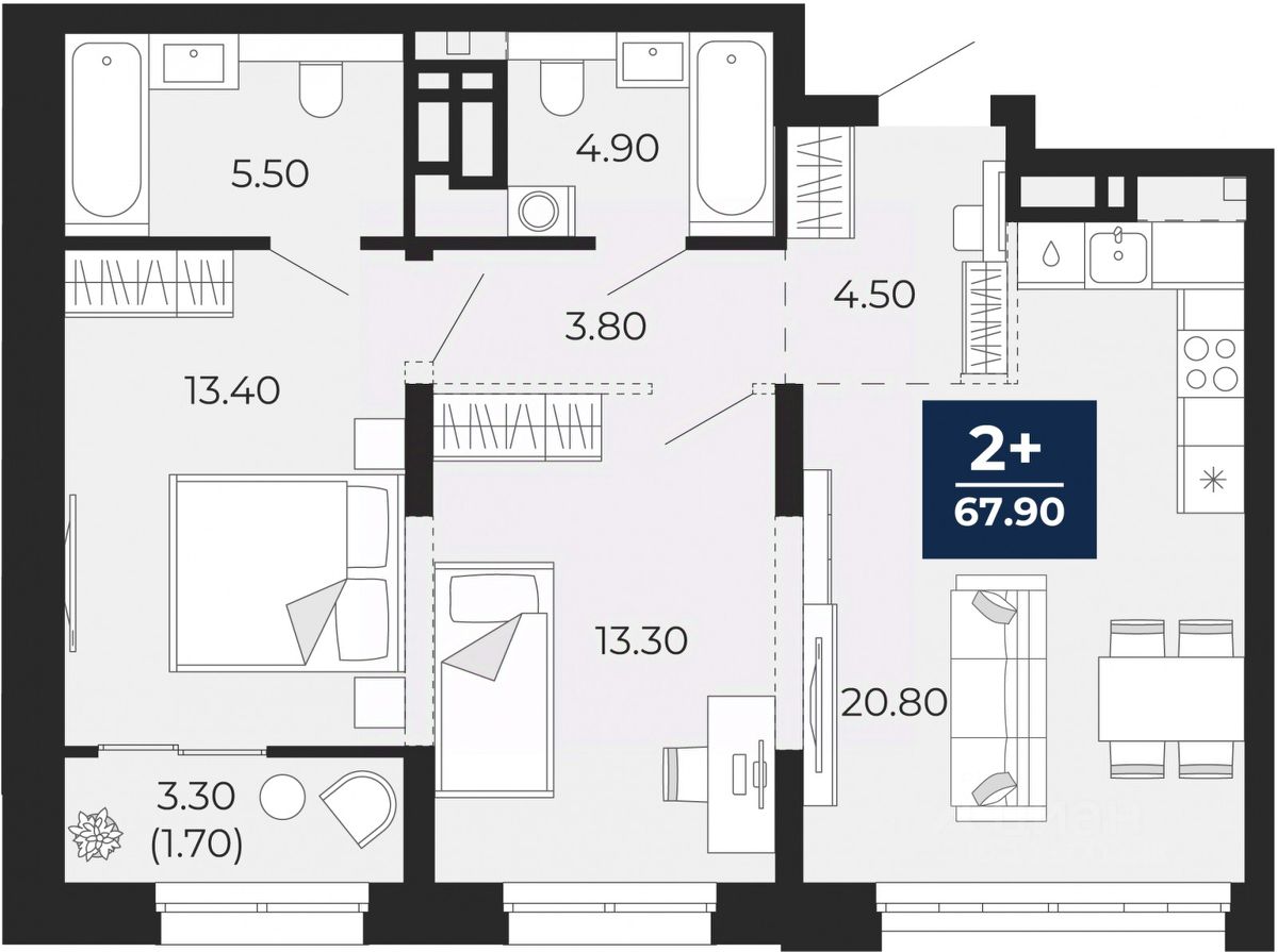 2-комн. квартира с предчистовой отделкой в ЖК "Айвазовский City" на 11 этаже. Общая площадь: 67.9 кв.м., жилая: 26.7 кв.м., площадь просторной кухни-столовой: 20.8 кв.м. Комнаты изолированные, все окна выходят на одну сторону. В квартире одна лоджия, два совмещенных санузла. Высота потолков 2.72 м.