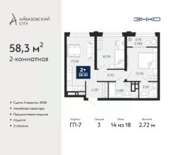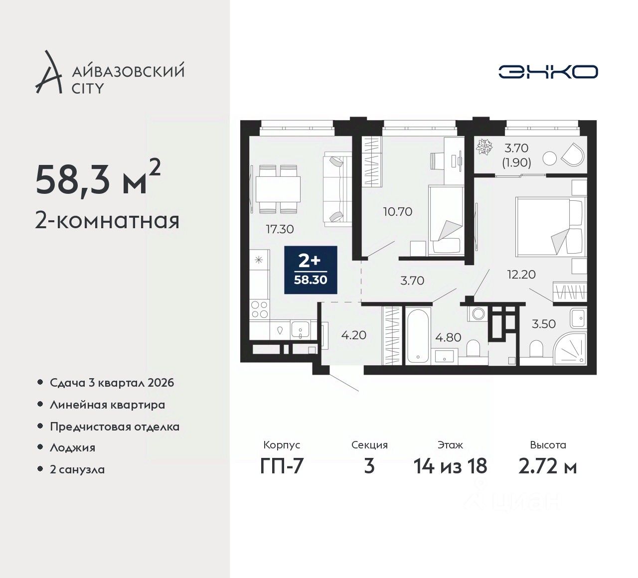 Двухкомнатная квартира от застройщика с предчистовой отделкой в ЖК "Айвазовский City" на 14 этаже. Общая площадь: 58.3 кв.м., жилая: 22.9 кв.м., площадь просторной кухни-столовой: 17.3 кв.м. Комнаты изолированные, все окна выходят на одну сторону. В квартире одна лоджия, два совмещенных санузла. Высота потолков 2.72 м.