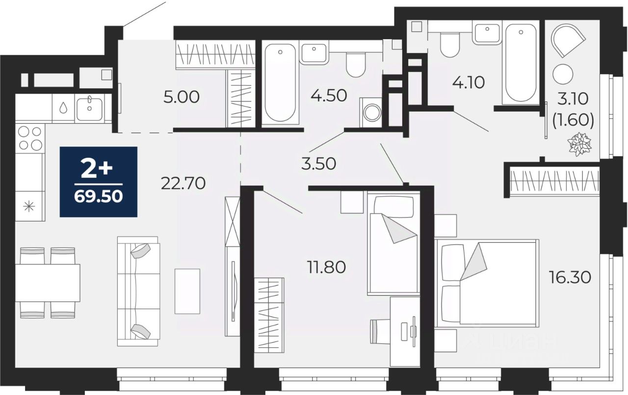 Двухкомнатная квартира от застройщика с предчистовой отделкой в ЖК "Айвазовский City" на 12 этаже. Общая площадь: 69.5 кв.м., жилая: 28.1 кв.м., площадь просторной кухни-столовой: 22.7 кв.м. Квартира угловая, очень светлая, естественная вентиляция при открытии окон. В квартире одна лоджия, два совмещенных санузла. Высота потолков 2.72 м.