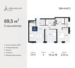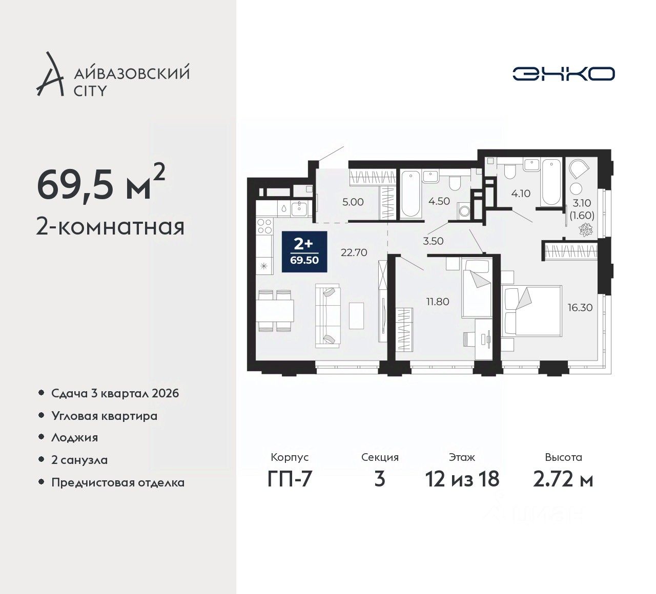 Двухкомнатная квартира от застройщика с предчистовой отделкой в ЖК "Айвазовский City" на 12 этаже. Общая площадь: 69.5 кв.м., жилая: 28.1 кв.м., площадь просторной кухни-столовой: 22.7 кв.м. Квартира угловая, идеально подойдет любителям тишины и панорамных видов. В квартире одна лоджия, два совмещенных санузла. Высота потолков 2.72 м.