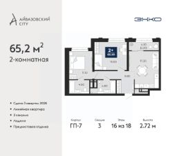 Просторная 2-комн. квартира с предчистовой отделкой в ЖК "Айвазовский City" на 16 этаже. Общая площадь: 65.2 кв.м., жилая: 26.6 кв.м., площадь просторной кухни-столовой: 17.2 кв.м. Комнаты изолированные, все окна выходят на одну сторону. В квартире одна лоджия, два совмещенных санузла. Высота потолков 2.72 м.